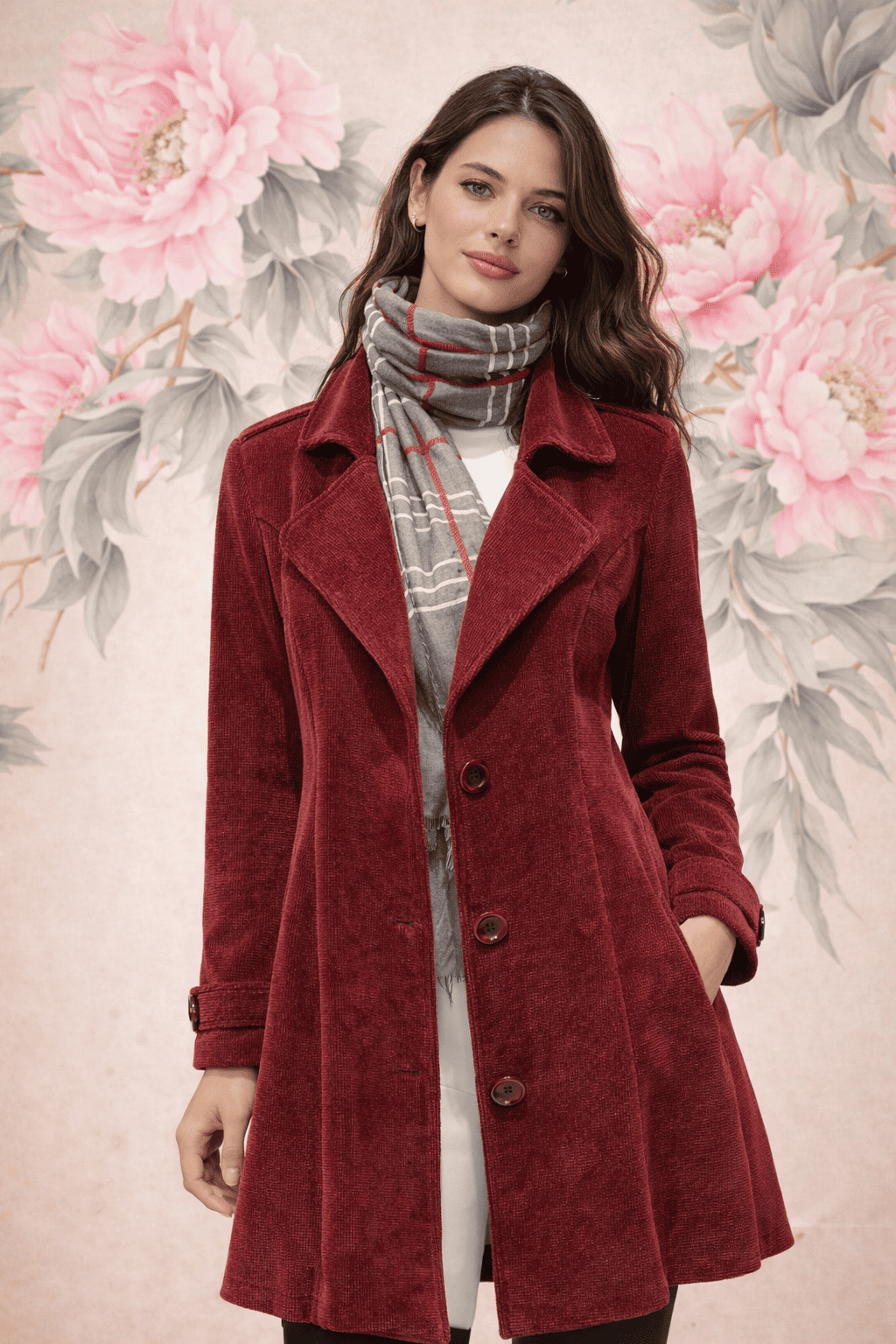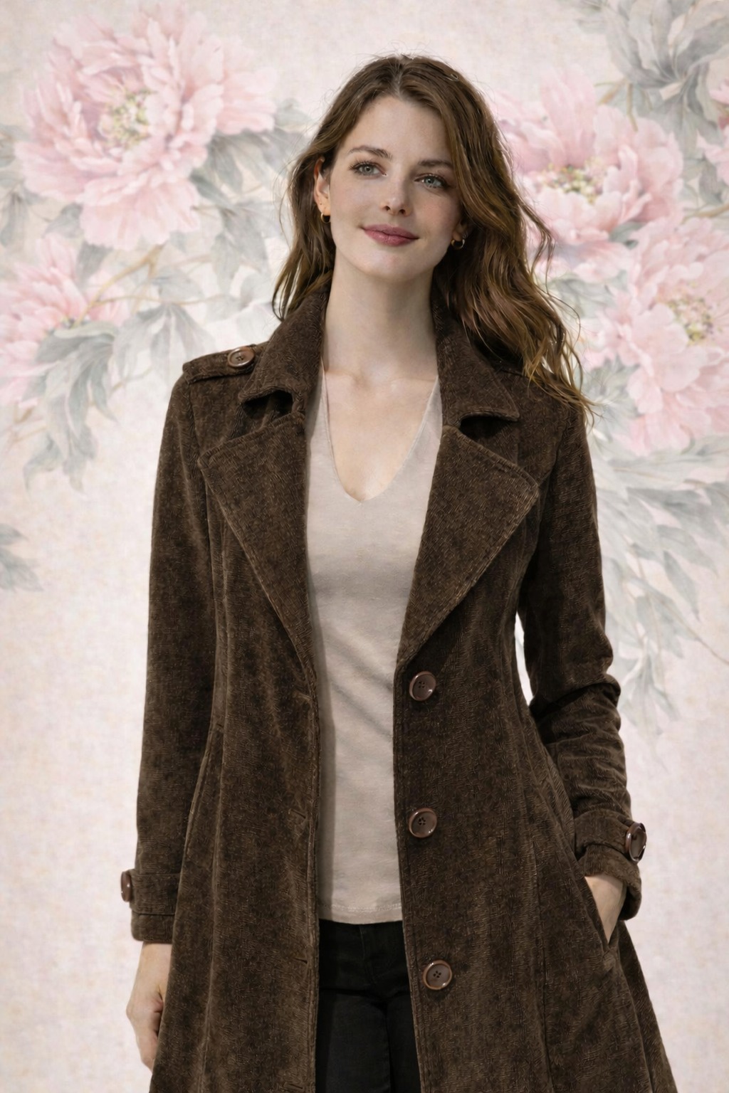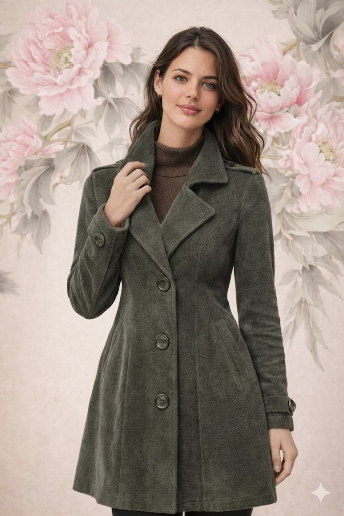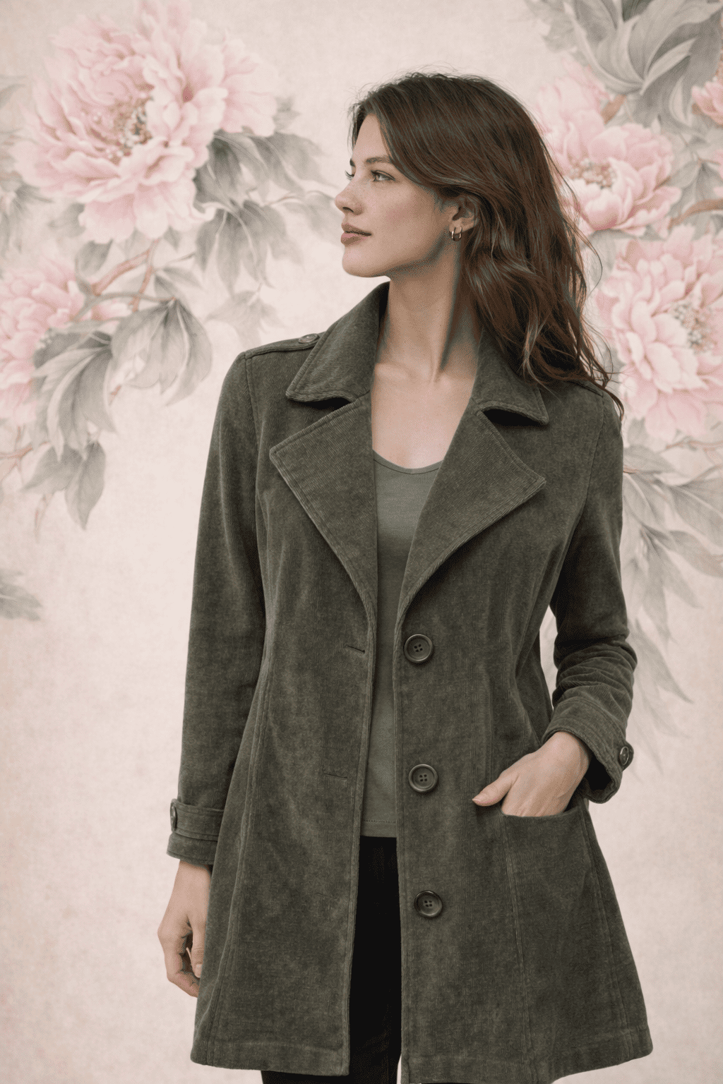 מעיל קטיפה בצבע זית המשלב מראה אלגנטי עם תחושת חמימות נעימה לימים קרירים. גזרה מחמיאה ועיצוב קלאסי שהופכים אותו לבחירה מושלמת להופעה מוקפדת ביום ובערב.