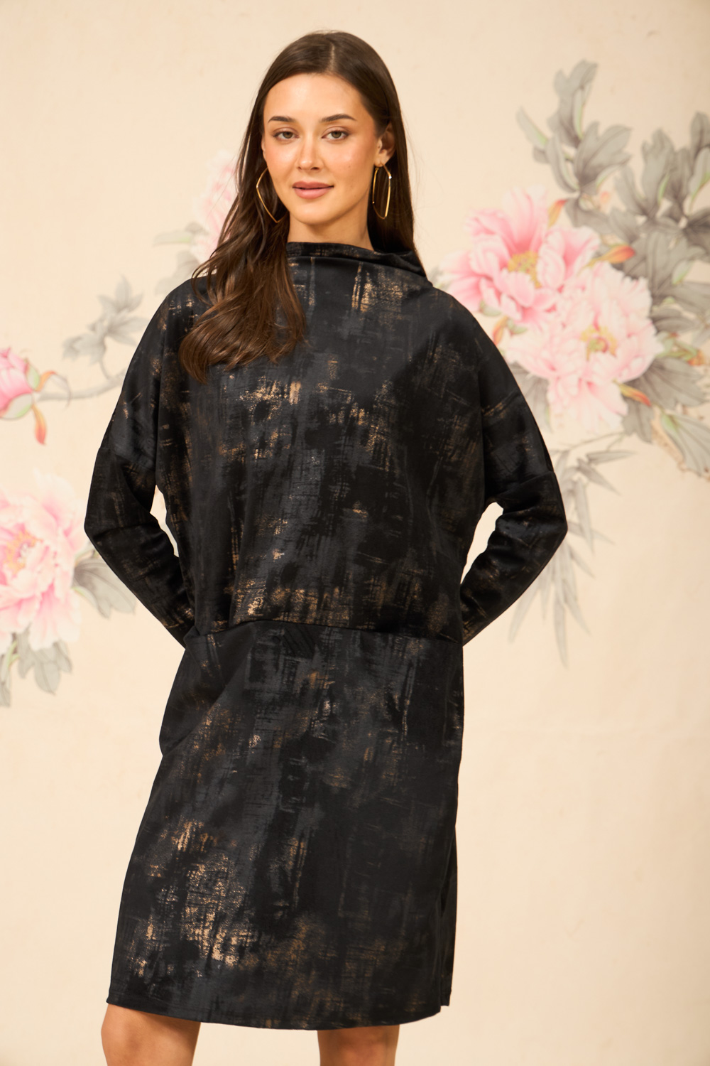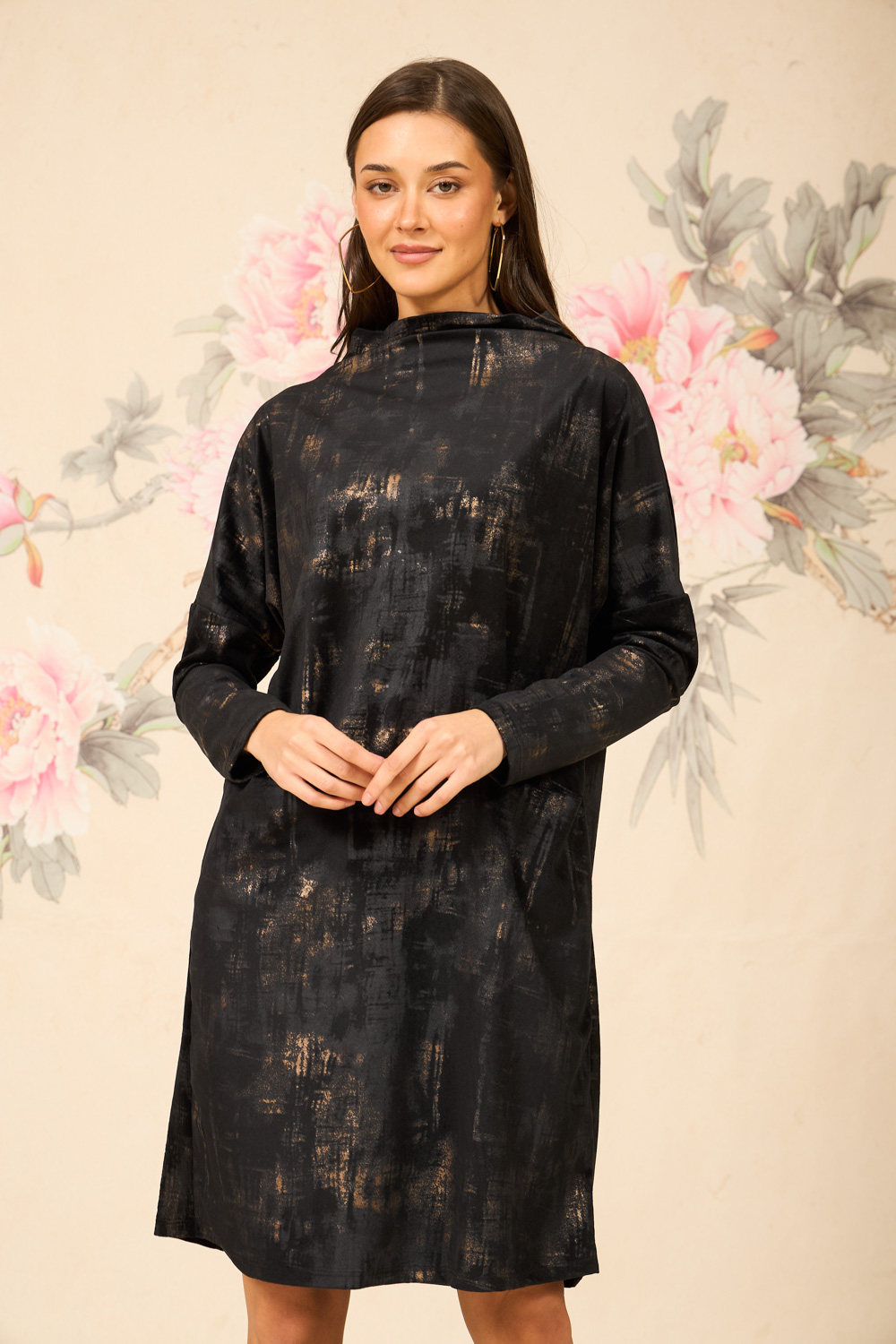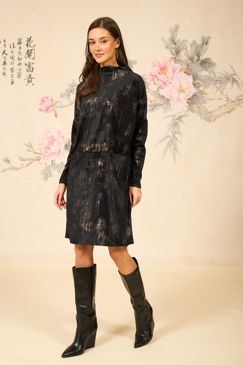 סינקופה ארוכה שחורה זהובה - שמלה אלגנטית בגזרה מחמיאה ומעודנת, מושלמת לאירועים ומעניקה מראה נשי ומרשים.