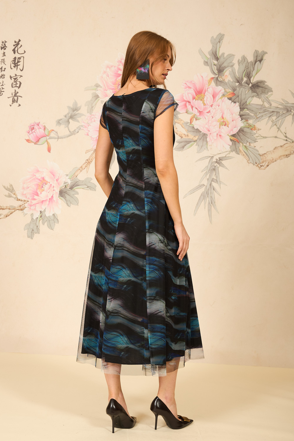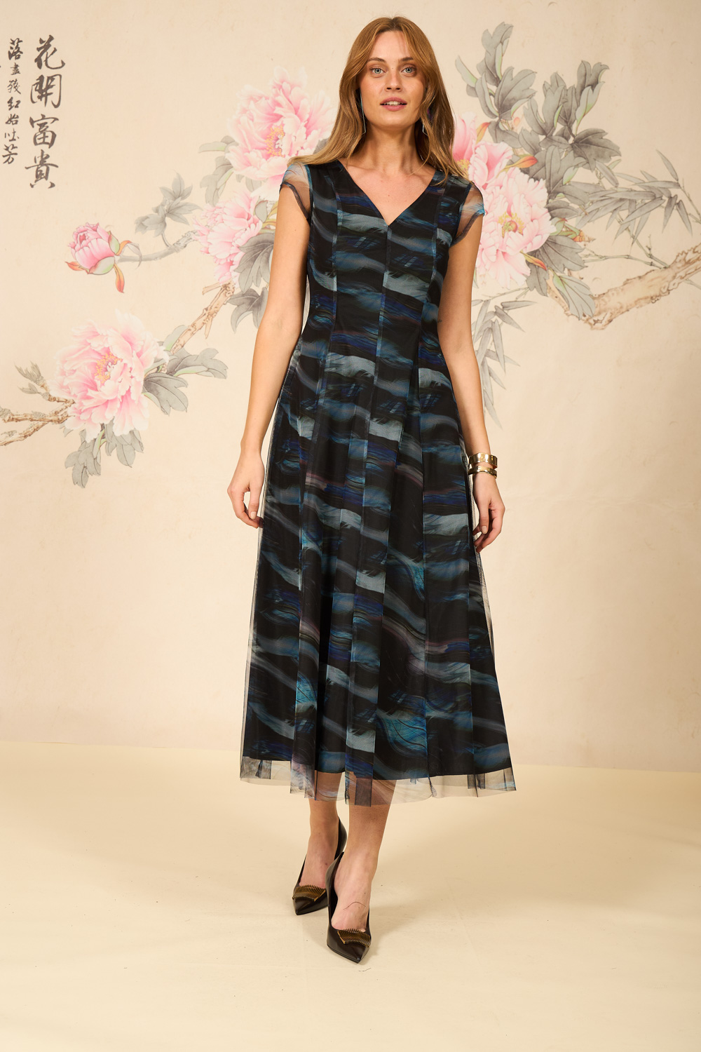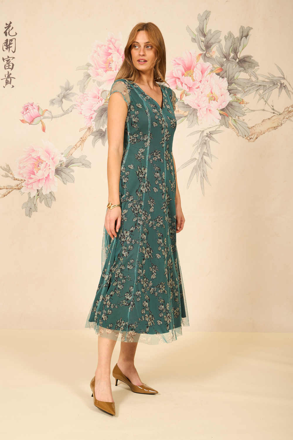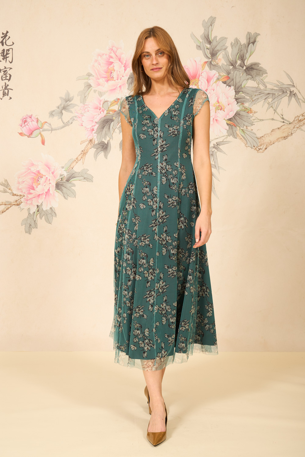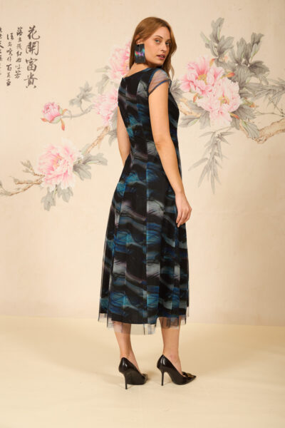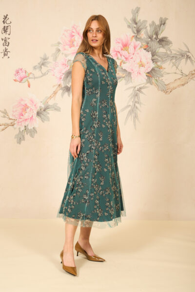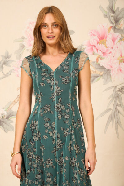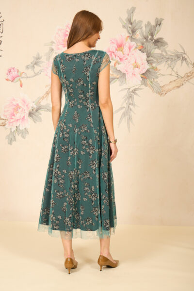 שמלה שיין מקסי עלים טורקיז מרשימה וקייצית, מתאימה ללבוש ביום ובערב.